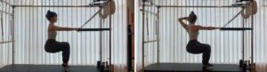 1. 푸시스루바를 양손으로 잡고 어깨너비로 선다. 2. 겨드랑이 아래쪽에 살짝의 긴장감을 잡아준다. 3. 엉덩이 의자에 앉는다고 생각하며 수직으로 내려간다. 4. 앉은 각도 그대로 올라온다. 변형 동작으로 힐업 추가/ 흉추회전까지 해준다. 발목이 회내,회외되지 않도록 주의하고, 팔,어깨만 열어내는게 아닌 흉추에서 움직임이 나오도록 한다. 전체적인 하지 강화 운동 플러스 발목 주변 근육들을 강화시켜주는 동작으로 기존의 스쿼트 동작을 맨몸으로 진행했을 때에는 몸이 무너졌다거나, 무릎이나 허리 어깨 등이 잘못 사용되기 쉬웠다면 대신 팔로 매달리기 쉽기 때문에 가볍게 쥐어줘야한다. 푸쉬스루바는 의지하지 않고, 도움받는 용도로 사용해야 한다. 캐딜락에선 롤다운바와 푸쉬스루바, 핸드스트랩과 풋스트랩 등 다양하게 사용하여 모든 전신 운동이 가능하다.