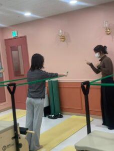 상지근육들의 움직임을 좀 더 인지하기 쉽게 필라테스 기구 체어에 소도구 밴드를 걸어 사용하였다. 하나하나 작은 움직임일지라도 정말 꼼꼼하게 잘 알려주는 지민샘이다.