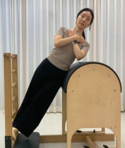 첫번째 동작은 사이드 밴드 동작이다. 1. 사이드 바라보고 바렐 곡선부분에 기대준다 2. 양팔 포개 몸통 사선 일직선으로 만들어준다 3. 마시는 호흡에 천천히 측면 자극 느끼며 몸통 내려간다 4. 내쉬는 호흡에 원위치 5. 6-10번 반복한다. 주의사항으로는 몸통 앞뒤로 흔들리지 않게 주의해줘야 한다. 사이드밴드의 효과로는 복사근 (옆구리 근육) 강화, 척추 측굴 움직임 향상, 허리통증 개선, 골반 안정성 향상이다. 두번째 동작으로는 브릿지 동작이다. 1. 바렐 곡선 부분에 상체대고 누워준다 2. 양발 골반 너비로 레더 위에 위치한다 3. 내쉬는호흡에 꼬리뼈부터 엉덩이-척추 하나하나 분절해서 올려준다 4. 어깨에서 무릎까지 일직선이 되도록 유지한다 5. 척추 분절하며 내려온다. 허리로 들어올리지 않고 분절해서 엉덩이 근육의 힘을 느껴본다. 브릿지의 효과로는 후면근육 강화, 척추 분절 움직임 향상, 골반 안정화, 허리통증 완화, 균형감각 향상이 있다. 우리 몸은 단순한 움직임이 아닌 촉각, 고유수용감각, 평형감각 등을 통해 뇌로 전달되는 신호에서 비롯된다. 정확한 움직임을 이끌어 내기 위해서는 이런 감각의 흐름을 읽어내는 능력을 향상시켜야 한다. 그래서 유유히필라테스에서는 운동 동작 ‘만’ 흉내내도록 하는게 아닌 이 동작을 해야하는 이유를 기반으로 수업을 진행하고 있다. 시범해주신 강사님은 물리치료 전공한 강사님으로 회원님들의 신체 상태를 빠르게 파악해 맞춤형으로 통증 케어를 해주셔서 그룹이든 1:1 개인레슨이든 높은 만족도를 이끌어 내주는 분이라고 한다. 전반적으로 굳어있는 몸을 깨워주고 싶은 사람들, 움직임이 너무 없어 여기저기 아픈 사람들, 조금씩이라도 몸을 사용하고 싶은 사람들 등 모두 유유히필라테스에서 맞이한다고 한다.