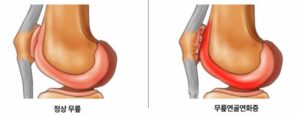 흔히 연골연화증(Chondromalacia Patellae, 슬개골 연골연화증) 이라고 하며, 젊은 층에서도 많이 나타난다. 원인은 무릎의 반복적 사용하는 달리기, 점프, 스쿼트 같은 활동으로 무릎 앞쪽에 지속적 압박이 발생된다. 슬개골 정렬 이상으로, 무릎이 안쪽/바깥쪽으로 치우쳐 움직이며 연골에 비정상적인 압력이 가해질 때. 허벅지 근육 불균형으로 인해서도 발생된다. 대퇴사두근(특히 내측광근, VMO) 약화 → 슬개골이 바깥쪽으로 당겨진다. 외상으로 무릎 부딪힘, 넘어짐 등으로 연골에 직접적인 손상이 가 가해진다. 체중 증가로 무릎 관절에 가해지는 압력이 커져 연골 마모 가속된다. 주요 증상으로는 무릎 앞쪽(특히 슬개골 주위) 통증, 계단 오르내릴 때, 쪼그려 앉을 때, 오래 앉았다가 일어날 때 통증 심해짐, 무릎 굽히고 일어설 때 뚝뚝, 사각사각 소리, 붓기, 무릎이 무거운 느낌 흔히 무릎이 시큰거린다, 계단 내려갈 때 아프다 라고 표현한다. 연골연화와 일반 ‘무릎 소리’ 차이로는 단순한 기포나 힘줄 마찰음 → 소리만 있음, 통증 없음, 소리 + 통증(특히 무릎 앞쪽) 동반된다. 치료 및 관리 방법으로는 생활 습관 조절로 무릎에 과한 부하가 가는 동작(쪼그려 앉기, 무거운 스쿼트, 계단 많이 오르기) 피하기 체중 관리 → 체중 1kg 증가 시 무릎에는 약 3~4배 하중 증가한다. 운동·재활로는 허벅지 앞쪽 근육(대퇴사두근, 특히 내측광근) 강화, 무릎 30° 굽힌 상태에서의 레그익스텐션, 밴드 이용한 무릎 펴기 운동, 둔근·햄스트링 강화로 무릎 안정성 보완한다. 클램셸, 힙 브리지, 밴드 워킹 등, 스트레칭, 햄스트링, 장경인대(IT band), 종아리 스트레칭으로 무릎 압박 완화한다. 물리치료·의료적 도움을 받는다. 온찜질, 전기치료, 초음파치료로 통증 완화, 심한 경우 연골 보호제(히알루론산 주사 등) 드물게 수술(관절내시경) 고려한다. 연골연화는 무릎 앞쪽 연골이 약해져 통증·소리가 동반되는 질환이다. 특징으로는 계단, 쪼그림, 오래 앉았다 일어날 때 증상 심화된다. 관리로는 체중 조절 + 근육 강화(특히 대퇴사두근·둔근) + 불필요한 부하 줄이기, 급성 손상 직후 (넘어짐, 삐끗함, 타박상, 인대 손상 등), 운동 후 무릎이 붓거나 열감이 있을 때, 관절 내부에 급성 염증이 생겼을 때 효과로는 혈관 수축 → 붓기·출혈·염증 감소, 신경 자극 완화 → 통증 진정, 근육 경직 완화, 방법으로 얼음팩, 냉찜질팩, 차가운 수건, 15~20분 적용 → 1시간 이상 간격으로 한다. 온찜질 (Heat Therapy)만성 통증 (무릎 연골연화, 퇴행성 관절염 등), 근육이 뭉쳐 있거나 뻣뻣해서 관절 움직임이 둔할 때, 운동 전 워밍업 보조로 관절·근육 이완할 때이다. 효과로는 혈관 확장 → 혈액순환 촉진, 근육 이완 → 뻣뻣함 완화, 관절의 만성 통증 완화한다. 방법으로는, 온찜질팩, 따뜻한 수건, 반신욕, 온욕을 20~30분 적용한다. 쉽게 정리하면, “갑자기 다쳤다, 붓거나 열난다” → 냉찜질, “오래된 무릎 통증, 뻣뻣하다, 쑤신다” → 온찜질을 하면 된다. 무릎에 적용 예시로는 스쿼트 후 무릎이 붓고 열감 있다 → 냉찜질, 연골연화증으로 무릎이 시큰하고 오래 앉으면 뻣뻣하다 → 온찜질, 만성 무릎 관절염 환자가 아침에 관절이 뻣뻣하다 → 온찜질을 하면 된다.