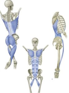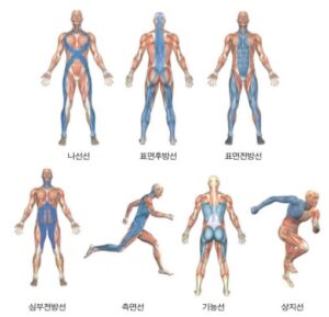 필라테스에서 말하는 표면전방선은 경로(대략): 발가락의 바닥(발가락 굽힘부) → 종아리 앞/정강이 주변 → 대퇴 전면(대퇴사두) → 골반 전면(장골능 주변) → 복직근 및 복부 근막 → 흉골과 쇄골 아래 → 목 전면(흉쇄유돌근 주변) → 안면(입·아래턱 근육까지 연결될 수 있음) 주요 구조로는 장지굴곡근/단지굴곡근(발가락), 전경골근, 장비골근·대퇴사두, 복직근·외복사근의 일부와 전면 흉부근막, 목의 얕은 전면 근육이 있다. 기능으로는 신체 전면을 세우고 굴곡·전굴(구부림) 포지션을 조절. 발가락에서 머리까지 전방압(전방으로 당기는 힘)을 전달해 ‘몸을 앞으로 끌어오는’ 역할을 함. 임상·운동적 의미로는 전방 긴장은 과도한 Kyphosis나 전방경사(Forward Head)·골반전방경사(Anterior pelvic tilt)와 연결될 수 있고, 오래 앉아 앞쪽 근육이 단축되면 무릎·골반·흉추의 가동성이 떨어짐, 호흡(복강압)과 복근의 기능이 약하면 전방선이 과다 긴장되어 허리 통증을 유발한다. 운동·교정 예시로는 슬로우 지면 발가락-발등 스트레칭 + 전경골근 활성화 (발목 도르래 운동), 무릎 굽혀 누워 복근호흡 재훈련 → 복부의 길이와 컨트롤 회복, 롤다운(척추 분절화)과 소프트 스트레칭으로 흉추 전굴 완화, 대퇴사두·장요근의 길이 늘리기(핀 포인트로 골반 정렬 유지)한다. 표면후방선 (Superficial Back Line, SBL / 표층후방선)의 경로는 발바닥 근막(족저근막) → 아킬레스건 → 종아리 후면(비복근·가자미근) → 햄스트링(대퇴 후면) → 둔부 근막(둔근과 장요골의 연결) → 천장골(골반후면) → 척추기립근과 후방 경막(두상까지 연결) → 후두부·머리덮개로, 주요 구조로는 족저근막, 비복근·가자미근, 햄스트링(반막·반건·대퇴이두), 대둔근·척추기립근, 후두하근막이 있다. 기능은 신체 뒤쪽을 ‘세우는’ 힘, 신전(extension)·체간 지지 역할. 지면 반발력을 위로 전달해 보행·달리기에서 추진력을 제공한다.평가는 서서 발가락 들어올리면 종아리·햄스트링의 반응 관찰하고, 굽힌 허리(슬픔 직다리 올리기)에서 허리 통증 발생 여부를 보고, 서서 앞으로 굽히기(손이 바닥에 닿는지)와 척추분절의 가동성 테스트를 한다. 심층전방선 (Deep Front Line, DFL / 심부전방선)의 경로는 발의 심부 구조(내전근·발중간 구조) → 대퇴 내측 근육군(내전근군) → 골반 내면(장요근 포함) → 흉곽 내면(횡격막·횡격막과 연결된 근막) → 경추 전면 및 흉골 근육까지 심부로 연결한다. 주요 구조로는 장요근·대퇴근막대체, 흉격막/횡격막, 경추 심부 근육(장간근 등), 내전근 일부이다. 기능은 코어의 ‘안정성 획득’과 호흡(횡격막)과 깊이 관련된 축 안정화. 골반과 흉곽 사이의 압력 관리(복강압 조절)에 핵심적이다. 운동·교정 예시로는 횡격막 호흡 재교육(누워 무릎 굽힌 상태에서의 배와 등 느낌), 심부 복근(Transversus abdominis) 활성화 훈련 — 복압 컨트롤 중심, 장요근 스트레칭과 동시에 코어 안정성 유지 연습을 한다. 측면선 (Lateral Line / 측측선)의 경로는 발바닥 바깥쪽·종아리의 외측 → 장경인대와 장측면 근육(장외측근) → 대퇴 외측(장근막대)를 거쳐 골반의 외측 → 외복사근·내복사근과 측면 흉벽 → 목의 한쪽 측면(안정화 근육)까지 연결한다. 주요 구조로는 비골근장, 장경인대, 복사근의 측면 구성, 사근류. 기능은 측면 안정성(측방 굽힘 저항), 균형과 측면 움직임의 조절. 일상 동작에서의 좌우 균형 유지에 중요하다. 표면전방선은 ‘앞쪽의 길이와 당김’, 표면후방선은 ‘뒤쪽의 지지와 추진’에 중요하다. 심층전방선은 내부 안정성(복압·횡격막)과 직결되어 만성 통증 관리에 핵심이다. 측면·나선·기능선은 균형·회전·대각선 힘 전달에 관여해 스포츠성과 일상동작의 효율을 좌우한다. 필라테스에서는 각 선의 긴장·약화를 평가 → 스트레칭 + 활성화 → 기능적 통합 순으로 접근하면 좋다. 운동으로는 측면 플랭크(정렬과 호흡에 초점), 힙 외전 강화(클램셸, 밴드 워크), 기능적 움직임에서의 코어 측면 제어 연습을 해주는게 좋다.